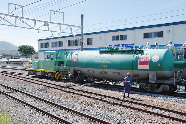 間に合ってラッキーでした。お次は引き上げた空タキを貨物レ発着用の下り一番線に 押し込んで行きます。下り1番線の前方には待機中の牽引機のEH200が見えてます。