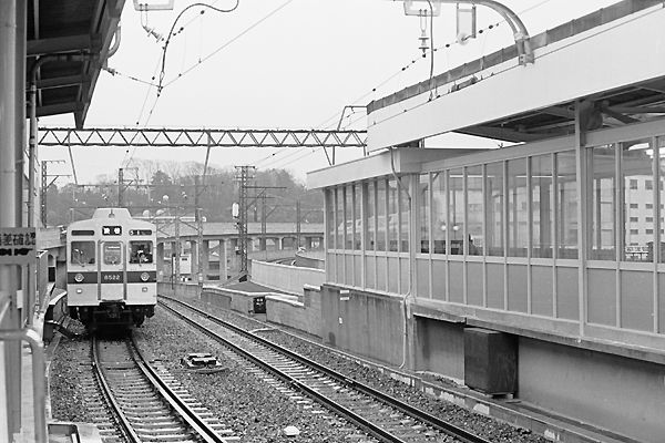 されていました。あれはダブルスリップじゃないと思うんだけど、昔々なんで自信無し。 分岐器を通過すると普通の複線駅風景が展開いたします。素人目に見りゃ、これなら シーサースクロッシング設置可能と思うんだけど、ナンカ不都合あったのかな? 東急 田園都市線 二子玉川(園) 1977-4 Photo by 松原の親方 |