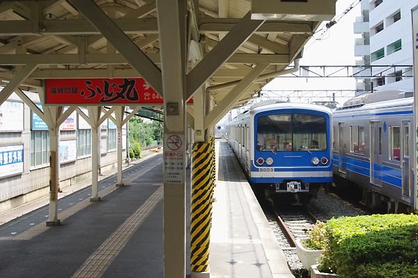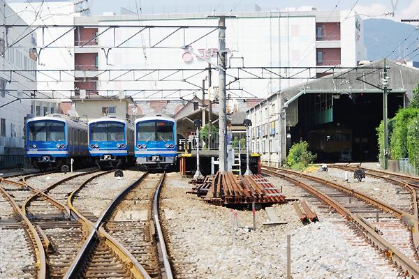 伊豆箱根鉄道大雄山線終着駅大雄山のほぼ全景でございます。ヤッパ、中小私鉄の 終着駅てぇのは、検収庫や電留線なんかの車庫施設の横並びにホームなんてぇのが、 アッシ的にゃ嬉しいのでございます。このアングルは改札出て、駅の周りを時計回で 道なりに約3分進んだ先の踏切から、簡単に撮れちゃいますぜ。踏切はホームからも 確認出来ちゃうけど、今は上の画像のレールを置いてある辺りにゃリレーボックスが、 設置されちゃてっから、定番ホーム端からの駅撮りは、期待出来ないのでございます。
