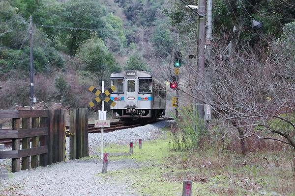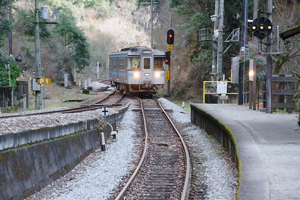 再び方向を変えた後、青現示に変わった下り出発信号を踏み出発して行く4237Dで ございます。秘境坪尻駅を発着する定期列車は、この14:54発4237Dを含め下り3本 上り4本っきりでございますが、国鉄時代にゃ本線が付いてた土讃線、特急「南風」の 上下ともほぼ1時間ヘッドに加え「しまんと」上下3往復、結構な本数の列車が坪尻を 通過いたします。なので、スイッチバック以外、其れなりに撮影本数を稼げるんです。