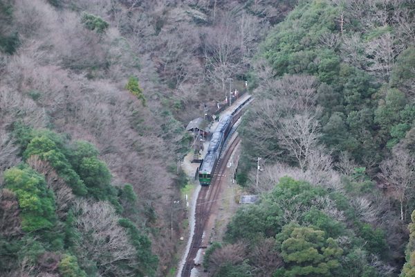最後はグーグルマップにも表記がある、評判の坪尻駅展望台から俯瞰で撮影した、 土日運転の観光列車「四国まんなか千年ものがたり」の入線でございます。坪尻に 7分停車の設定だけど、途中下車する人なんて普通はいないよねぇ。 土讃線 坪尻 2020-1 Photo by 団長 |