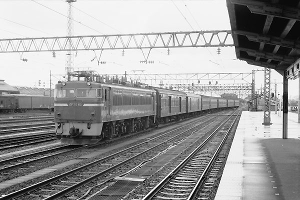 途こちらは、地平時代の金沢駅に進入する荷物車、郵便車と旧客を連ねたEF70 60。 同じF級EF81増備が仇、国鉄所属のまんま生涯を終えちゃった薄幸のカマなのです。