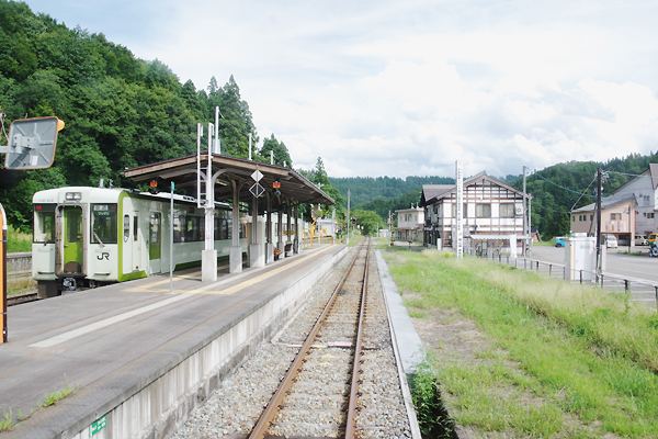 皆様の予想どおりの展開、今回は飯山線乗車中に最後部から時々思い出した様に 発車後スナップした駅撮り写真でございます。越後川口を出た列車が、最初に停まる 内ヶ巻でございます。駅舎は新しくなってるけど、マトモナ造りで好感が持てますねぇ。