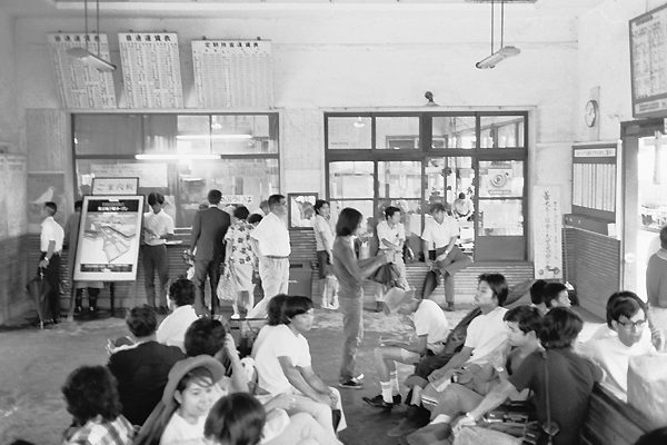 駅舎中っ側はこんな感じ、正面左側が乗車券類発売窓口、所謂出札口でございます。 2人乗客が椅子代わりに座っちゃてる右っ側の大きな引き戸の窓口は、鉄道小荷物の 受け渡し窓口なんです。人手の掛かる事が大嫌いなJRになっちゃった、今じゃ殆んど 見る事叶わぬ駅風景となりました。出札口の上に掛ってる、手書きの運賃表も好し。