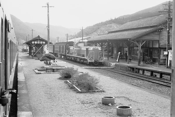 今じゃ駅舎に面した片面ホームだけになっちゃった、サミットの矢岳駅でございますが、 当時は2面3線国鉄型の定番配線、DD51牽引の旧客普通列車と交換でございます。 肥薩線 矢岳