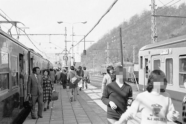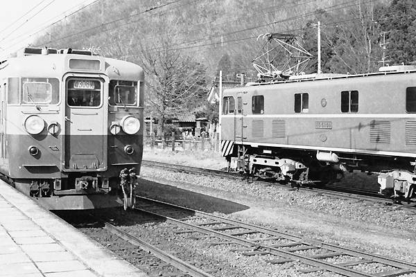 今回の駅撮りは、名誉団長撮影の信越本線屋代を蔵出しスキャンでアップ致しました。 昔は行楽目的で国鉄から私鉄へ乗り入れる、地域輸送で私鉄から国鉄に乗り入れる、 なんてスジが、全国各地ににございました。信越本線屋代から長電河東(屋代)線に 乗り入れる、上野〜湯田中の急行志賀もそんなの一つ列車でございました。湯田中を 出発して河東(屋代)線経由で屋代駅3番線に到着する、169系4308M急行志賀1号を 出迎えるのは、定山渓から長電に来たED100型電気機関車5101号機でございます。