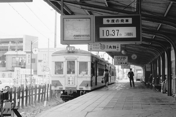 御面相のモ1800形と瓜二つ車両でございます。それもそのはず、豊鉄のモ1850形も 元は愛電のデハ3300系列でございました。そして、ホームの上屋からぶら下がってる アナログな発車時刻表示板や駅名表、丸物百貨店の広告表示板も懐かしいやねぇ。