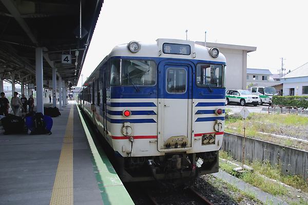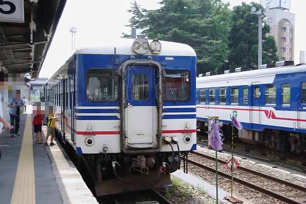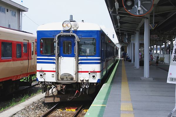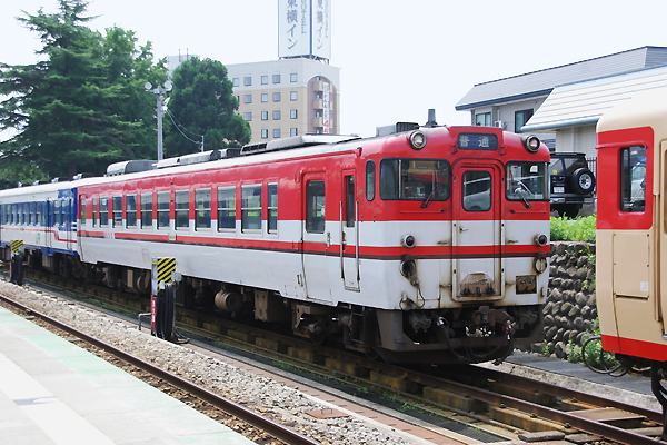 駅本屋に近い4番線に停車中の12:16発坂町行き2両編成は、前がキハ52 120号車