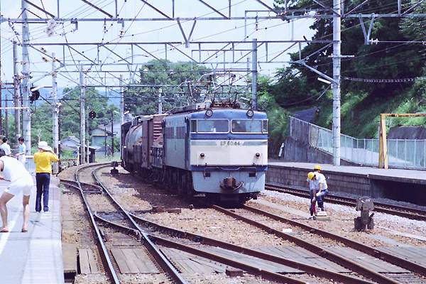 3コマ目は短い海側の中線にEF60が置いてった、タキ+トラ+ワム+トラの貨車4両を E101が連結した後でございます。これで大井川鐡道本線に貨車4両を牽いてE101が、 戻って行きゃ金谷での入換作業はお開きです。でも、EF60は一体何処に消えたの? 最後尾に付いてっヨは如何なっちゃったの?ッてな疑問が、空っぽの頭の中に沸いて 来たんで、無い知恵絞って推測しちゃいました。当時撮った他の画像を見るてぇっと、 海側の短い中線は、上下方向ともダブルスリップで分岐してんのが分ります。なので、 EF60は貨車を解放した後、牧之原トンネル出入り口の間に在る、安全側線みたいな 短い側線?に突っ込む。今度はそこから山側の中線を通り、再び上り方向のダブル スリップから海側の中線へ転線、ヨ1両を連結して上り貨物列車として出発しちゃう。 こんな入換の終った後に撮ったのが、2コマ目に上げたE101のカットだと推測です。 国鉄時代はチョットした駅なら何処でも見られた、入換作業ってホントに面白かった。 飽きもしないでず〜っと見てましたねぇ。でもフィルム代が、懐に響くんで写真の方は、 殆ど撮ってないんです。 東海道本線 金谷 1983-8 Photo by 松原の親方 |