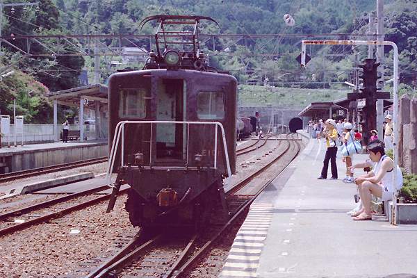 既にEF60の姿は無く、貨物を受け取りに来たと思われる、大井川鐡道のオリジナル E10型1号機が、東海道上り本線横切って長短どっちかの中線へ転線するとこでした。 そして、E101の後方短い方の中線にEF60が持って来た貨物が、停まってんの確認 できますね。なので、2コマ目はE101が、短い中線に転線してる最中のスナップです。