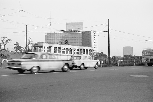 若葉一丁目を出た都電は、単線の専用軌道となり外濠通沿いを赤坂見附に向かって 紀之国坂を下っていきます。なので、上のコマに写ってった信号機は、単線区間用の 閉塞信号ってなとこでしょうかねぇ。それにしても、2コマ目のバックに写ってるビルが、 近景にホテルニューオータニ、遠景に霞が関ビルのたった2棟だけとは! 都電3系統 若葉一丁目 1967-12 Photo by 団長 |