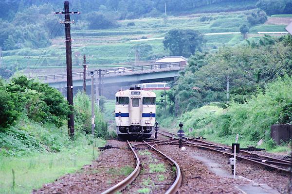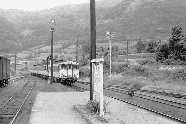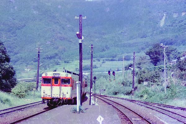 お次は、赤字解消を因縁に国鉄の存在が危うくなってきた頃、同じく急行用気動車と しての運用が終焉に差し掛かってきた、キハ58系急行「火の山」の到着でございます。 1985-8 Photo by 名誉団長