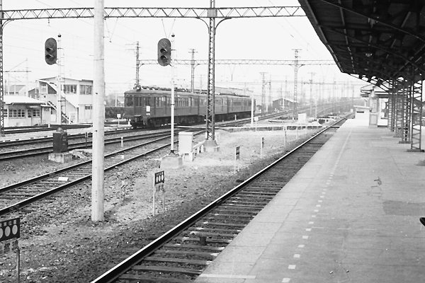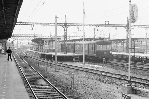 今回の駅撮り探検団は、松原物故団員が残してくれた銀塩写真の蔵出しスキャンで お楽しみ頂きます。桂駅橋上化以前は、京都本線上下ホームに挟まれていた、処に 嵐山線発着用4・5線ホームがございました。その嵐山線ホームに入って来た車両は、 車体色こそモノクロでも何となくマールーンっと納得しちゃう単色なんだけど、車体の 方は如何見たって阪急らしさ0%じゃないすっか。それもその筈、この200形は現在の 京都本線系統を戦前開業した京阪の子会社新京阪が、Mc+Tcの2両編成を1本だけ 製造した車両なのでございます。この200形新京阪時代の形式が、調べても判んない のです。名車P-6の次に製造したからP-7てぇ事じゃ無かったようなのでございます。