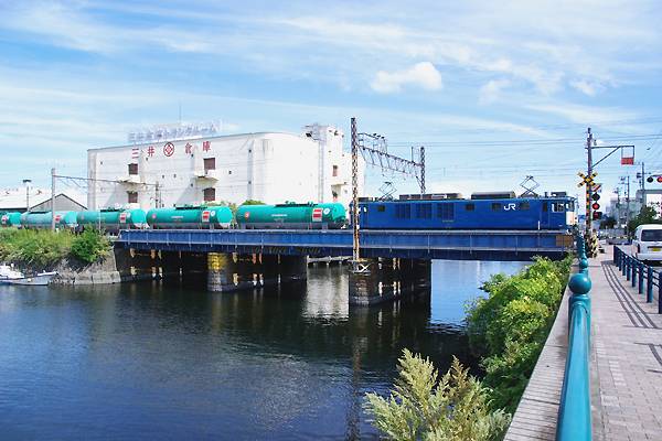 三井倉庫バックに瑞穂埠頭から続く水路に架かる橋を渡り、臨港風景の中東高島へ 駅へ進入する「愛」EF64 1012号機。警報機は、会社道なる、珍名踏切でございます。 東海道本線高島貨物支線 東高島 2011-9