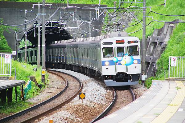 すずかけ台上り方面にある短いトンネルを抜けて駅に進入する、今も(2021年10月) Bunkamura号装飾で稼働中、青帯に正面のみTQQ装飾時代の8637Fでございます。 東急田園都市線 すずかけ台 2010-8