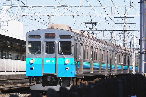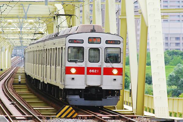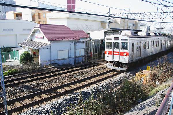 早い時代から高架区間になった、曳舟〜玉ノ井(現東向島)から地平に降りたとこに 相対式真ん中に上下通過線、2面4線の鐘ヶ淵がございます。その上り通過線を走る 伊豆急色のまんま廃車になった8614Fでございます。普段はただの伊豆急色ですが、 毎年夏になるてぇっと「伊豆のなつ」なんてヘッドシール貼っ付けてましたっけ。 東武伊勢崎線 鐘ヶ淵 2009-2