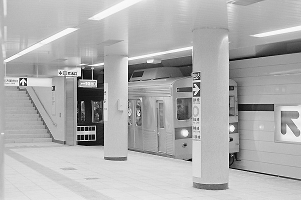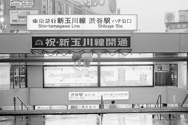 デジタルも銀塩も同じ串刺し駅撮りしちゃう、今も昔も変わらない思鉄の適当写真で アップは、物故団員松原君が残してくれた原版を蔵出しスキャンでお届けする、東急 8500系駅撮りシリーズ最終回の新玉線開業直後の渋谷駅でございます。今と大違い 人も疎らなホームに進入する、串刺しとなっちまった8500系の失敗スナップなですが、 ここは一つ柱に注目して頂きたいんです。右側の柱に貼ってある案内表示、上から 「のりかえ」「→」そして其の下、「国鉄線 JNR Lines」って書いてあるんです。だけど、 当時の国鉄渋谷駅は、山手線単独駅なのにナンデ複数形にしたんだろう?国鉄って 表示にゃ如何しても反応してしまう、国鉄・JRを通して鉄に嵌っているアッシなんです。