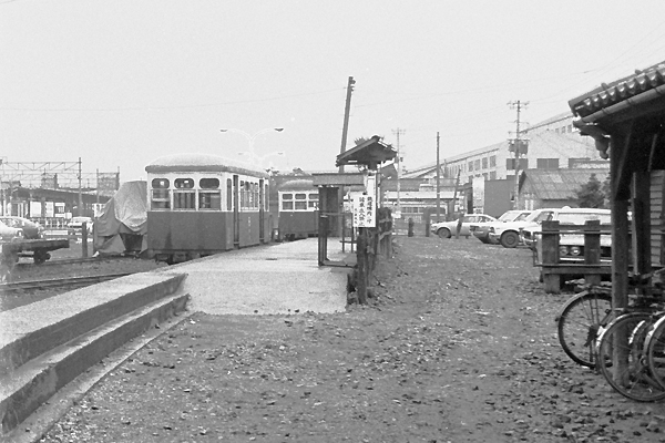 国鉄・北鉄っと来りゃ駅撮り探検団小松三部作取りをとるのは、非電化ナローのまま 1977年の廃止まで運行した尾小屋鉄道の新小松でございます。片面の低いホームに 停まっているのは、撮影当時でも車齢40年まで後1年ってなヴィンテージな気動車の 戦前生まれのキハ1でございます。新制時は当然の様にガソリンエンジンだったけど、 製造は雛に稀なる日車御謹製なのです。更に嬉しい事にゃ、キハ1は今も石川県営の 公的機関らしい、いしかわ子ども交流センター小松館なかよし鉄道で動態保存中なの でございます。キハ1の左後方に見えるのは、やっぱ戦前梅鉢製木造客車のホハフ3。 右の木造2階建ての家屋が、新小松の駅本屋兼尾小屋鉄道本社と記憶しております。 そして、駅構内手前を横切る道路の踏切は、1種は1種でも警手の操作安全確認する 今となっては見ることが出来なくなった、マニュアルな踏切でございました。