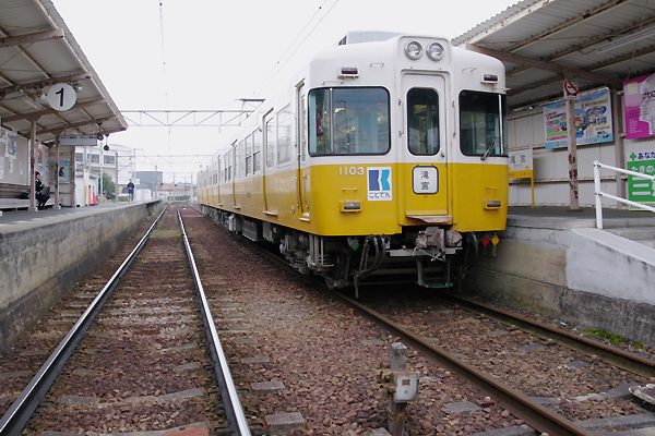 高松市内栗林公園駅から金毘羅様のお膝元琴平を目指した琴平電鉄が、初っ端に 開業した区間の終点だった、滝宮での駅撮りをアップでございます。相対式2面2線の ホームと1番線の裏に留置線1本がある滝宮駅2番線に停まっているのは、元京王の 5000系ご当地琴電じゃ1100形を名乗っております。交換可能な高宮でございますが、 1100形の停まっている2番線は、ラッシュ時一宮から当駅までスジを延長して運転の 区間列車のほぼ専用発着ホームとなっております。撮ったのは10:30位なんで、夕方 ラッシュ時まで滝宮でお休み、働くオト〜サンにゃ実に羨ましい勤務時間なのです。