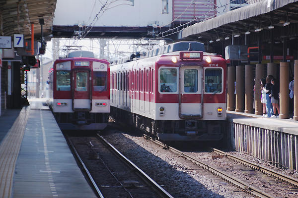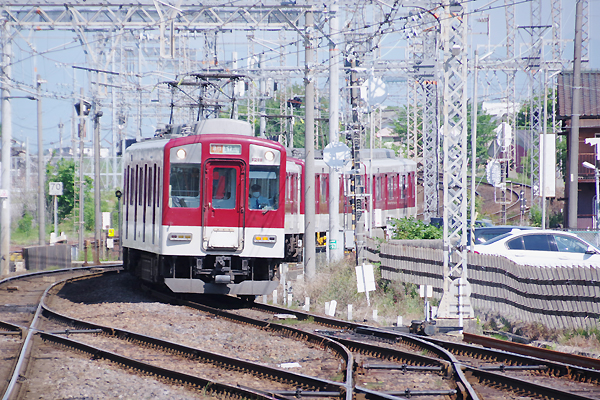 次はJR側から横断地下道通って近鉄側に回る、線路沿いの公道から今風近鉄顔の 元祖1201系の回送車を駅傍スナップ、写り込んだ昭和チックなコンクリ柵も問題無し。