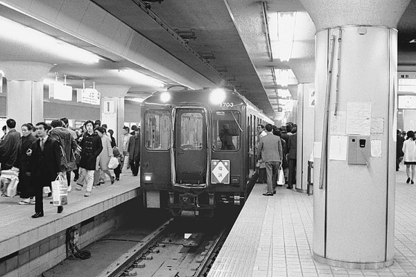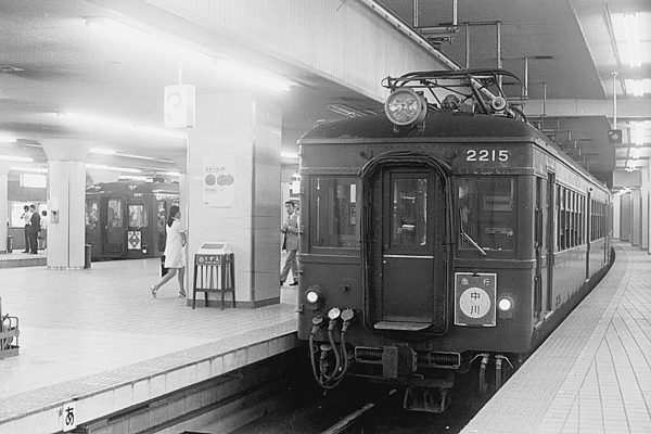 今回の駅撮り探検団は、伊勢電・参急とも悲願だった、名古屋延伸を野合か円満か、 知らないけど、(資金=参急)+(免許=伊勢電)=関西急行電鉄に因って1938年に 開業した、70年代の近鉄名古屋でございます。今も昔も変わらない急行列車用発着 ホーム3番線に停車中の列車は、戦前長距離用吊り掛け電車の最高峰モ2200系で ございます。しかし、世は当に旧性能車淘汰の時代、写真のモ2215車も自慢だった 片目の前面も両目、乗降ドアは3ドア化、参急デ2200系の面影は、薄くなってました。 左っ側の2番線に見えてるのは、レア形式ク1950形の1951号車が、先頭の塩浜行 準急列車でございます。2ドアの2200系は、コチラ。でも、ホントは2227系ってヤツ。