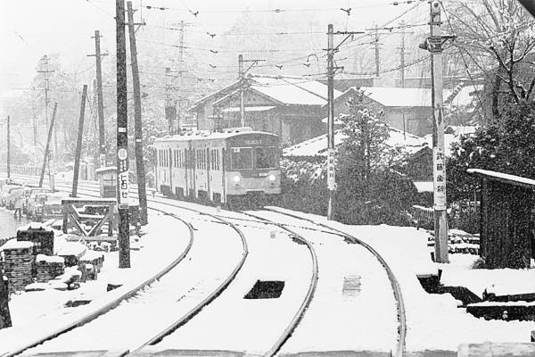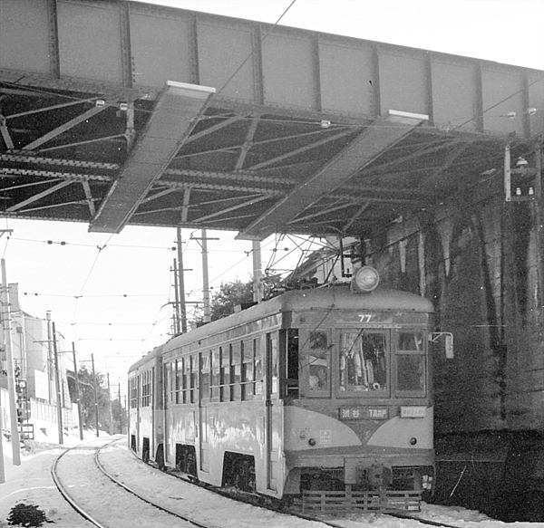 前回アップの豪徳寺は、複線時代の小田急じゃ都内唯一、築堤上に設置された駅で ござました。で、何故そんなお足が掛かっちゃう造りにしたかってぇっと、既に地上にゃ 世田谷線てぇよっか、玉電が、走ってたからなんです。ってな事で、小田急線豪徳寺の 駅撮りとくりゃ、次は玉電山下駅撮りしかございません。先ずは、小田急線の橋梁下を 抜け玉電山下に到着する、連結二人乗りのデハ70形最終バッチ77号+78号2連です。 赤地に白文字「渋谷-下高井戸」サボ表示で判っちゃう、渋谷-二子玉川間廃止直前、 駅名としちゃぁ玉電山下、最後の雪景色でございます 東京急行電鉄 下高井戸線 玉電山下 1969-3 Photo by 松原の親方