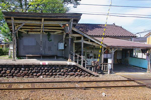 そして、上下交換列車の発車した後に現れたのが、極端に短い木製のホーム上屋に 駅舎へ続く木製手摺の付いた階段、駅舎自体も早く外から眺めたい感が一杯です。