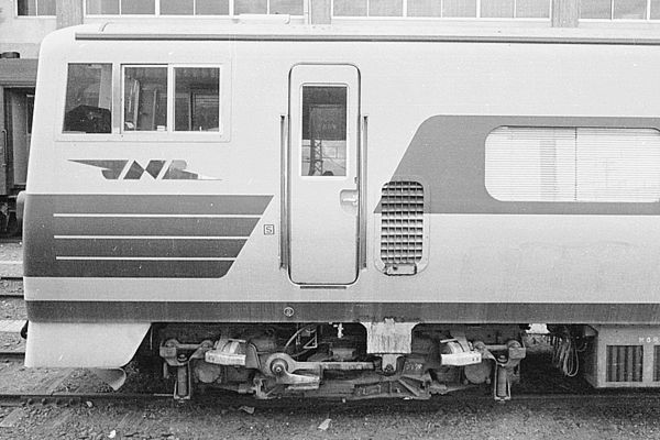 掃いてる台車の形式は、クモハ591のと何処が違うかアッシにゃよく分かんないけど、 別形式のDT95ってな形式でございます。しかし、381系のデビューは1973年、591系 駅撮りは1975年、てぇことは、振り子試験車としちゃお役御免になってったのかな? それにしちゃ、見た目車体はきれいだから、時々稼働してたなのかな? 国鉄 信越本線 長野 1975-8 Photo by 、名誉団長 |