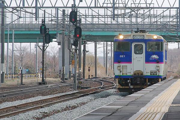 キハ40下り列車発車から約7分後、今度は室蘭本線上り普通列車が、2番線に到着。 下りのキハ40は、定番の1700番台でございましたが、上りの苫小牧行は、製造経費 ケッチって新製したら、10年チョイしか保かった日高本線用キハ130の後釜に再度の 登場となった、700番台から再改造したキハ40 350番台の運用でございました。