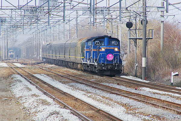 そして、キハ40 350番台と入れ替わりに架線柱の彼方から現れ、接近通過して行った 寝台特急「トワイライトエクスプレス」でございました。8:12から8:57の45分間に撮れた、 9年前(2014年)のジャンクション沼ノ端での高効率駅撮りでした。 室蘭本線 沼ノ端 2014-5 Photo by 団長 |