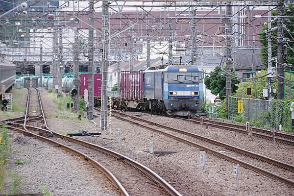 トンネルを出て下り貨物線を通過するEH500 78号機。アッシみたいに写り込みなんて 気にしなきゃ、武蔵野線旅客用ホームにいりゃ、上り列車も駅撮り出来ちゃいます。 でも、写ってる旅客列車用到着ホームに列車停車中に貨物レが、接近通過しちゃうと 2019-2