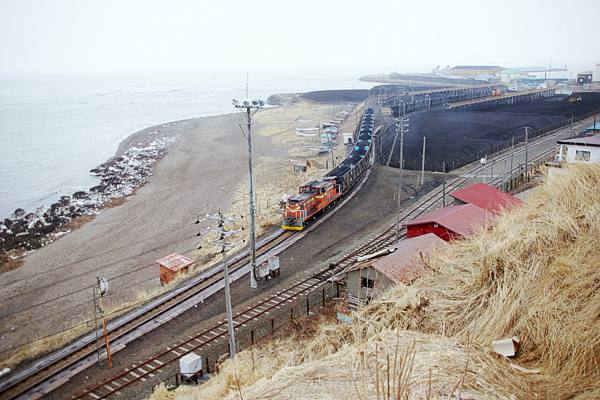 太平洋炭鉱専用線(太平洋石炭販売臨港線)の始発駅春採に続き、今回は終着駅の 知人をアップでございます。終着駅と言っても実際は、運炭専用線の駅なんで構内で 駅撮りなんてぇなぁ当然御法度、撮ったのは釧路崎灯台の建ってる、高台からです。 その高台眼下の線路にD701先頭とする運炭列車が、知人駅場内に進入してきます。