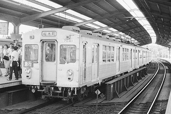 向かい側東横線下りホームにゃ、旧7000形急行桜木町行。長方形赤地に白抜きの 急行種別札も懐かしいですね。一見クーラーに見える、ファインデリアも懐かしい。
