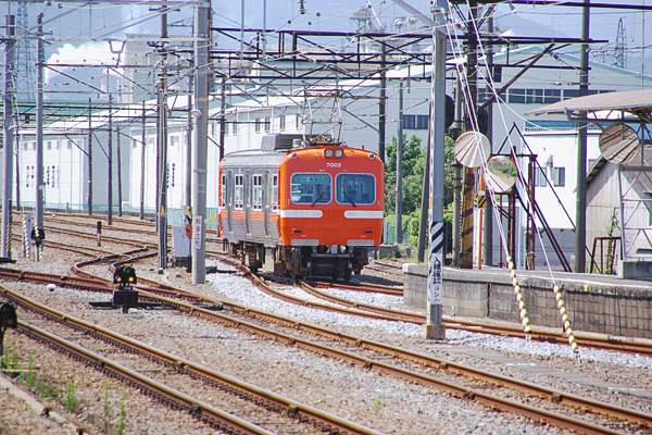 旅客ホーム西側にレンズを振れば、元京王井の頭線3000系の岳南鉄道7000系が、