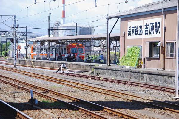 何故か普段あまり使わない山側の1番線に到着するところ。駅本屋の壁面に書いて ある社名と線名って、他の私鉄にも見られるけど、会社規模と字の大きさは、何故か 反比例してんですよねぇ。なお、撮影は、岳南電車に社名変更前です。しかし、昔は 私鉄との接続駅で、普通に見られた貨物の受け渡し、今も見られる駅って富田以外 直ぐに答えが出てこないぞ。 東海道本線 岳南電車 吉原 2011 8 Photo by 団長 |