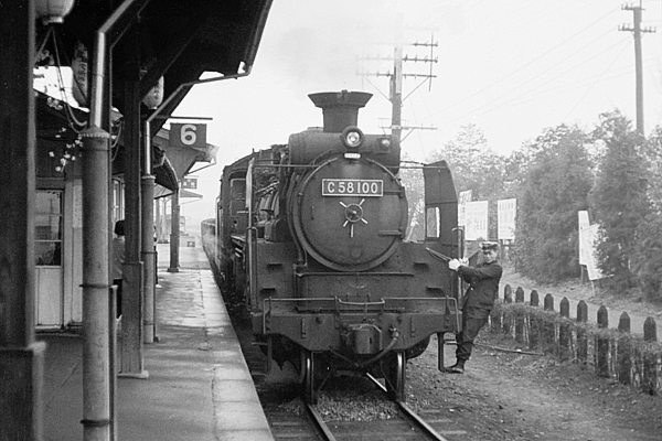 島式ホーム3面6線の寄居駅、前回アップした秩父鉄道が、三つ並んだ島式ホームの 真ん中、3・4番線ホームに発着してました。今回の駅撮りは、秩父鉄道の北側にある 5・6番線の国鉄八高線を松原物故団員の遺作から、蔵出しスキャンでアップしました。 先ず登場は、6番線下り本線を入換仕業で通過中「高一」C58 100号機でございます。 だけど、駅でも線路っ端でも、撮ってる時にこんな切りの良い機番が、ファインダーに 入るてぇっと、アッシなんざぁスッゴク時した気分になっちゃうですよねぇ。非電化当時