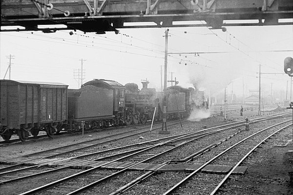 八高線で稼動してた蒸気機関車は、「高一」と「八」のC58とD51、そのC58が、重連で 秩父鉄道と八高線の間に在った、国鉄の貨物授受線で入換仕業中のとこを3・4番線 からスナップです。それから、架線の在るのが、秩父鉄道所属、非電化なのが国鉄、 右端に見える2灯式の信号が、秩父鉄道の出発信号ですね。八高線の出発信号は、 未だ腕木式出発信号でした。先頭のC58のキャブんとこに在るのが、確認できます。