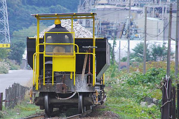 ホッパー車の形式記号は、テコ300形とテコ400形の2形式、いずれも画像に写ってる 様に添乗員スペースとハンドブレーキ付きでございます。しかし、テコてぇなぁ風変りな 記号ですねぇ。アッシぁテは手ブレーキ、コは鉱石だ思ったたんだけど、ググッてみっと 違ってった。なお、DS-6は、だいぶ前に引退して余生をタイで過ごしてるそうです。 デンカ原石線 原石積載場 2009 10 Photo by 団長 |