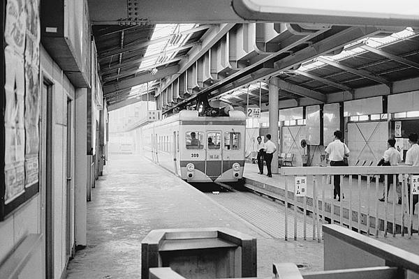 2コマ目は、300形309F出発を少し引いて左側からの撮った、当時の湘南モノレール 大船駅ホームほぼ全景カットでございます。このカット見てアレェ?なんか違うぞっと、 違和感を覚えたアナタは、本物の駅撮りファンでございます。列車と正対した位置に 写り込んだラッチの一部、今と正反対の乗降ホームってな画像から考えられんのは、 開業から何年間か経ってから駅舎が、建替えられたんじゃないかってぇ答えですね。 で、ググるてぇっと、1992/6に新しくなってました。よく見っと、壁もプレハブぽいやね。