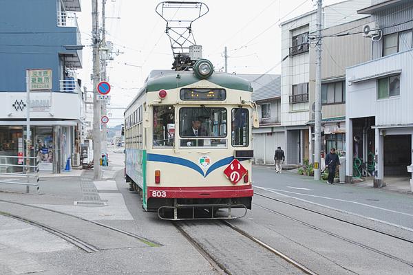 伊野停留所にやって来たのは、土佐電名物菱形サボを挿した、山陽電軌から譲渡車 瀬戸内育ちの800形803号車でした。そして、823の左っ側に見える途切れたレールに