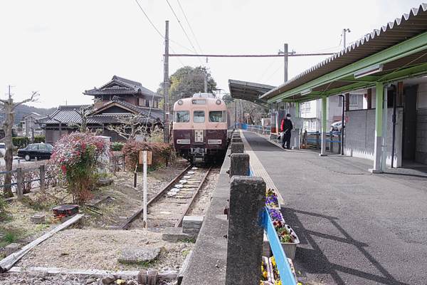 列車とは反対側にカメラを180度パンするてぇっと、中々と佇まいの宜しい木造駅舎と 改札口にゃ、簡素な造りのパイプ製ラッチが、ファインダー越しに見えちゃいました。