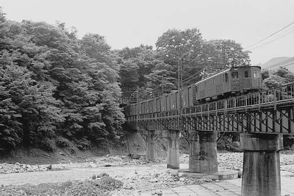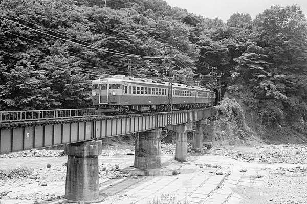 今回の駅撮り探検団は、松原物故団員撮影の銀塩から蔵出しスキャンでのアップは、 身延線波高島の駅撮りでございますが、駅から上り方面に200m位の所、常盤川に 架るガーター橋を渡る列車をスナップした、駅傍撮りとなります。最初に隧道を抜けて 鉄橋に姿を現したのは、私鉄富士身延鉄道が開通させた、トンネル断面に合わせて 低屋根800番台を含んだ編成の165系急行「富士川」静岡発〜甲府行でございます。 なお、この角度からの撮影は、県道9号線の道路橋開通後は、不可能になりました。
