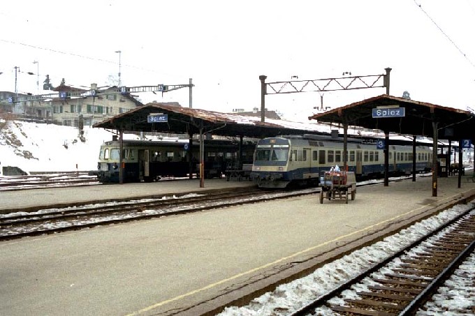 Spiez には機関区と工場が在り、 BLS の中心駅、ホームに停車中の電車は2編成ともBLSの
