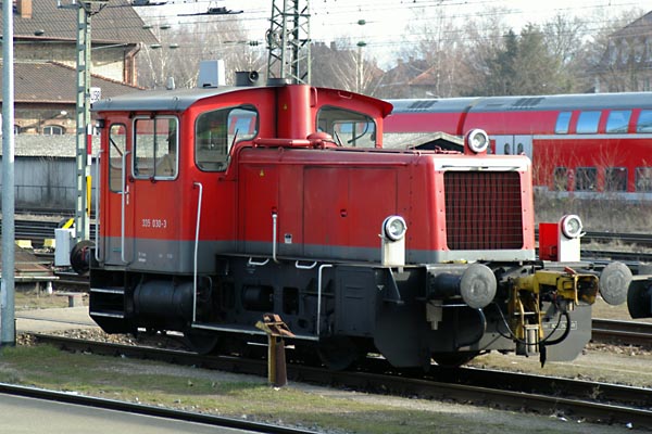 DBの小型入換用液体式ディーゼル機関車335型、出力は177kw、最高速度40km。機関車というより 車両移動機と言った方が似合う小型機関車。