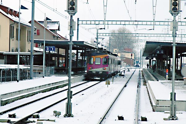この鉄道はFLP(Lugano-Ponte Tresa Railway)と言ってLuganoから12km南西にあるPonte Tresaの町まで行っているメーターゲージ地方私鉄です。いかにもイタリア語圏らしいニコチャンマークの電車はこの私鉄の主力Be 4/8で、この他古いタイプの車両もあるようですが、乗る時間が無く見ることは出来ませんでした。実はLuganoから2,3駅先で線路がLugano湖を築堤で渡るところがあり、そこで写真を撮ろうと思い現地に行ったけど湖面を吹く風が強く寒く、トテモじゃなけど耐えられず、対抗列車がすぐに来たので迷わず乗車、LuganoでICに乗り換え再びアルプスの北側へっても、来た時と同じ線区を戻っても詰らないので、Luzern経由で帰ることにした。幸いにも乗ったICはLuzern経由SBB Basel行き、ここまま乗り換え無しでLuzernまで行けるので、ほぼ爆睡状態でLuzerunへ到着。ここから支線に乗ってLenzburgに行きそこからチューリッヒまで戻ることにする。 |