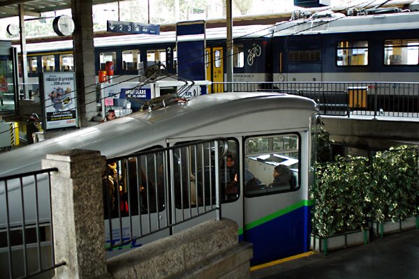 2月16日 トンネルを抜けて見た景色は・・・なぁーだよ!アルプスの北と変わらない鉛色の空の下、雪に埋もれた寒そうAiroloの駅。結局、Luganoに着いてもお天道様は顔を出してくれません。当てが外れたLugano駅はLugano湖を見下ろす段丘の中腹にあり、湖畔の市街地とはちょっと離れています。そこで1番線ホームに接して市街地へ下るケーブルカーの乗り場があります。 |