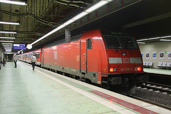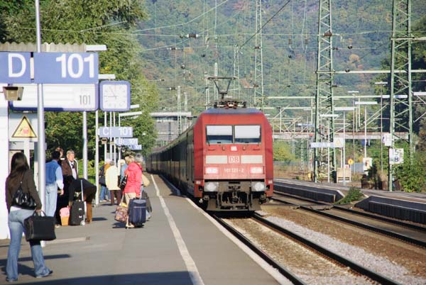 電気機関車牽引のIC が走り抜けてきたので、思わず立ち止りシャッターを押す。乗車予定は8:52発のEC115列車、駅に着いて今日から使うユーロパスに有効印を貰おうと駅の出札窓口へ行ったら開いていない。横の看板見ると9時からオープンと書いてるじゃん!こりゃ〜大変、8:52にゃ間に合わないぞ、開くまで待って次の列車じゃ時間が勿体ないし、なんて考えていたらDB101型電気機関車に引か