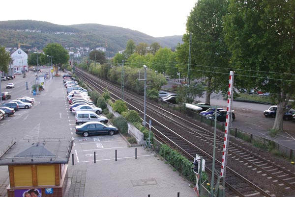 非電化の支線が出ています。そうそう、アッシが何故 Frankfurt に泊まらないで日本じゃマイナーな Bingen に来たかと言うと、事前にネットでホテルを予約しようとしたらこの時期、Frankfurt は見本市開催中らしくホテル代金がどこでも通常の倍以上。そこで Frankfurt から30分から1時間以内で所でお手ごろ価格のホテルと言う条件で、DBの時刻表の検索結果のページからリンクしているホテル検索のページで探して決めたのが、Bingen の Rheinhotel Strckenburger Hof と言うホテル。グーグルの航空写真で見ると線路際に建っているので予約フォームのコメント欄に「線路の見える部屋が有れば御願い。」っと書いたら、大当たりぃ〜!ホテルに着くと早速女将さんが案内してくれました。部屋番号