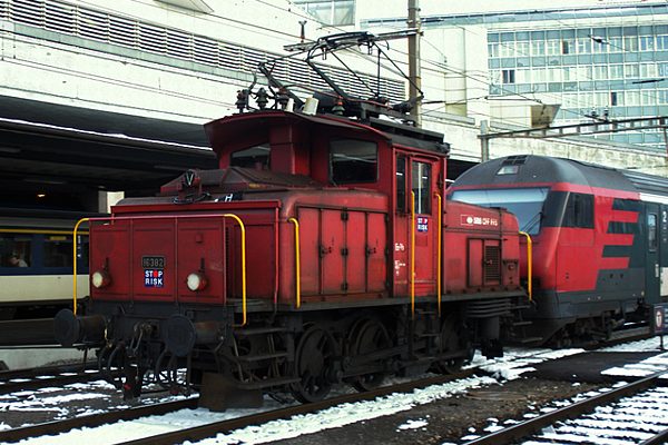 スイス全土見られるロッド駆動の入換用電気機関車Ee 3/3。写真の16382号機は1944年〜1947年に SLM, ABB, MFO, SAAS などで製造されたバッチの内の1両。出力502kw、自重39t、全長9.51m、 最高族度、50km/hです。なお現在は形式改番でEe 930になっています。