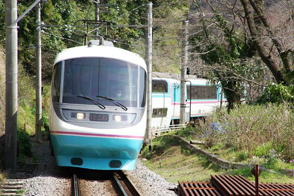 時代から50000形の現在まで、その魅力は鉄な人の心をそうでない人の心もガッチリ 掴んで離さないのでございます。なので、ヘッドマーク探検団でも2度出し・3度出しと 称し、過去にSE3000形、NSE3100形、LSE7000形、MSE60000形などの「はこね」を ご紹介してきました。そこで、今回のHM探検団はRSE20000形の「はこね」なんぞを ご覧頂ければと思うのでございます。20000形はJR御殿場線乗り入れの「あさぎり」が 本職なので、ロザ仕様のスパーシートを設置したダブルデッカーサハ車が編成に2両 組み込まれており、料金は新宿〜箱根湯本でナント670円なんです。100km以内で 1000円ボッタクル○○東日本とは大違い、スーパーシートのRES「はこね」に乗って 箱根まで一っ風呂浴びに行くなんざ、中々オツナ志向じゃございませんか?みなさん。 箱根登山鉄道 箱根湯本〜入生田 2009-3 |